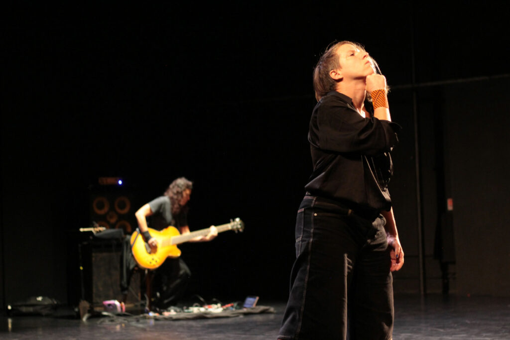 Depuis près d’une décennie, Marinette Dozeville s’immerge dans la question du féminisme à travers ses créations chorégraphiques, tandis que la compagnie place la sororité au cœur de son projet global. Après un cycle de quatre pièces collectives (BREAKING THE BACKBOARD, 2020, AMAZONES, 2021, C’est comme ça que don Quichotte décida de sauver le monde – Acte 1, 2023, Acte 2, 2024), Marinette Dozeville ressent le besoin et la curiosité de revenir à l’exercice spécifique du solo dansé, chargée, voire hantée, par ces années d’exploration sororale et de renforcement collectif, ici en dialogue au plateau avec Fanny Lasfargues, bassiste.
