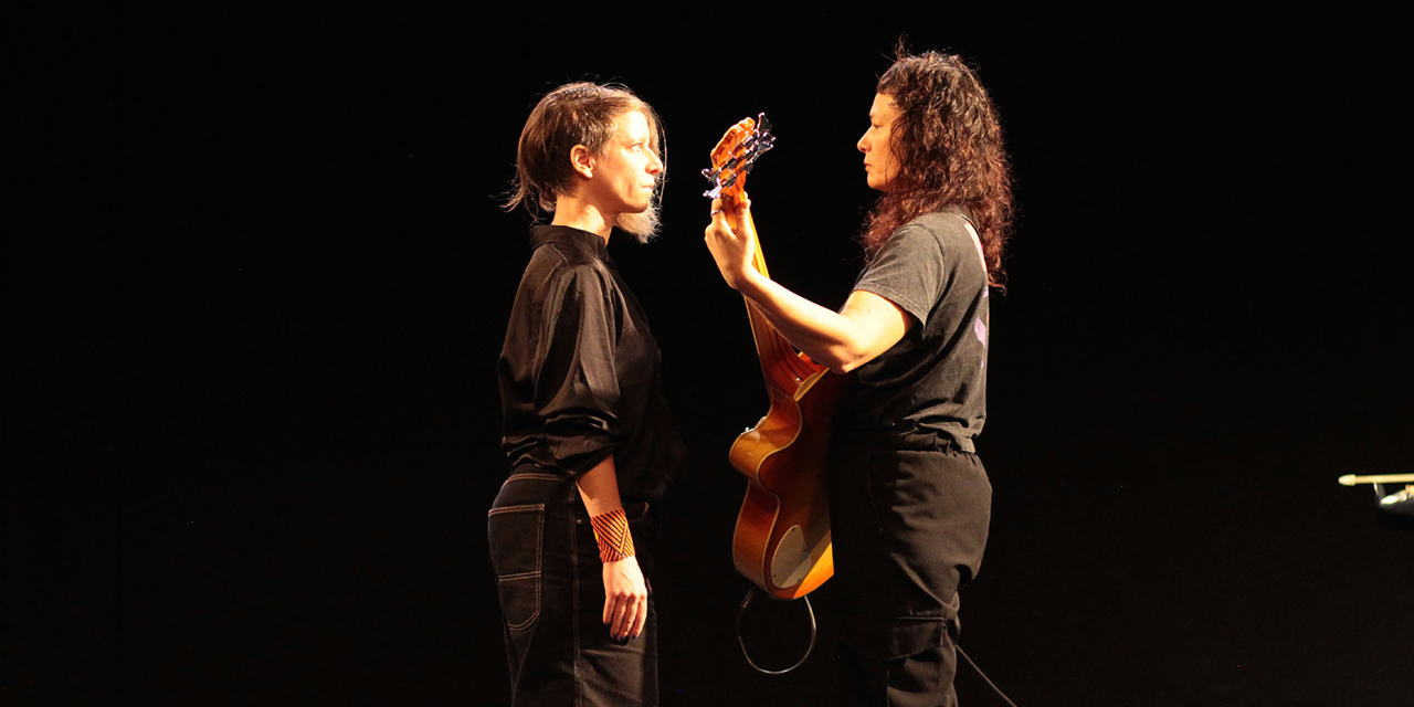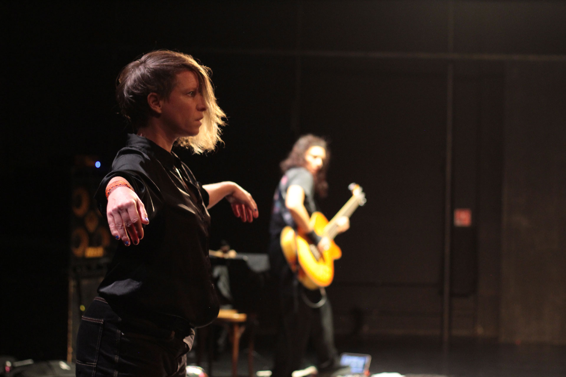 Depuis près d’une décennie, Marinette Dozeville s’immerge dans la question du féminisme à travers ses créations chorégraphiques, tandis que la compagnie place la sororité au cœur de son projet global. Après un cycle de quatre pièces collectives (BREAKING THE BACKBOARD, 2020, AMAZONES, 2021, C’est comme ça que don Quichotte décida de sauver le monde – Acte 1, 2023, Acte 2, 2024), Marinette Dozeville ressent le besoin et la curiosité de revenir à l’exercice spécifique du solo dansé, chargée, voire hantée, par ces années d’exploration sororale et de renforcement collectif, ici en dialogue au plateau avec Fanny Lasfargues, bassiste.